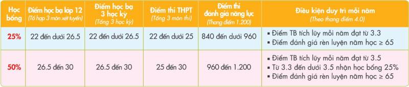 2. Học bổng Tiếng Anh: Chứng chỉ IELST từ 5.0 trở lên hoặc tương đương được giảm học phí tương ứng các cấp độ tiếng Anh từ cấp độ 3 đến cấp độ 7 3. Học bổng nhập học: Miễn lệ phí nhập học 3.000.000 đồng cho 300 thí sinh nhập học sớm